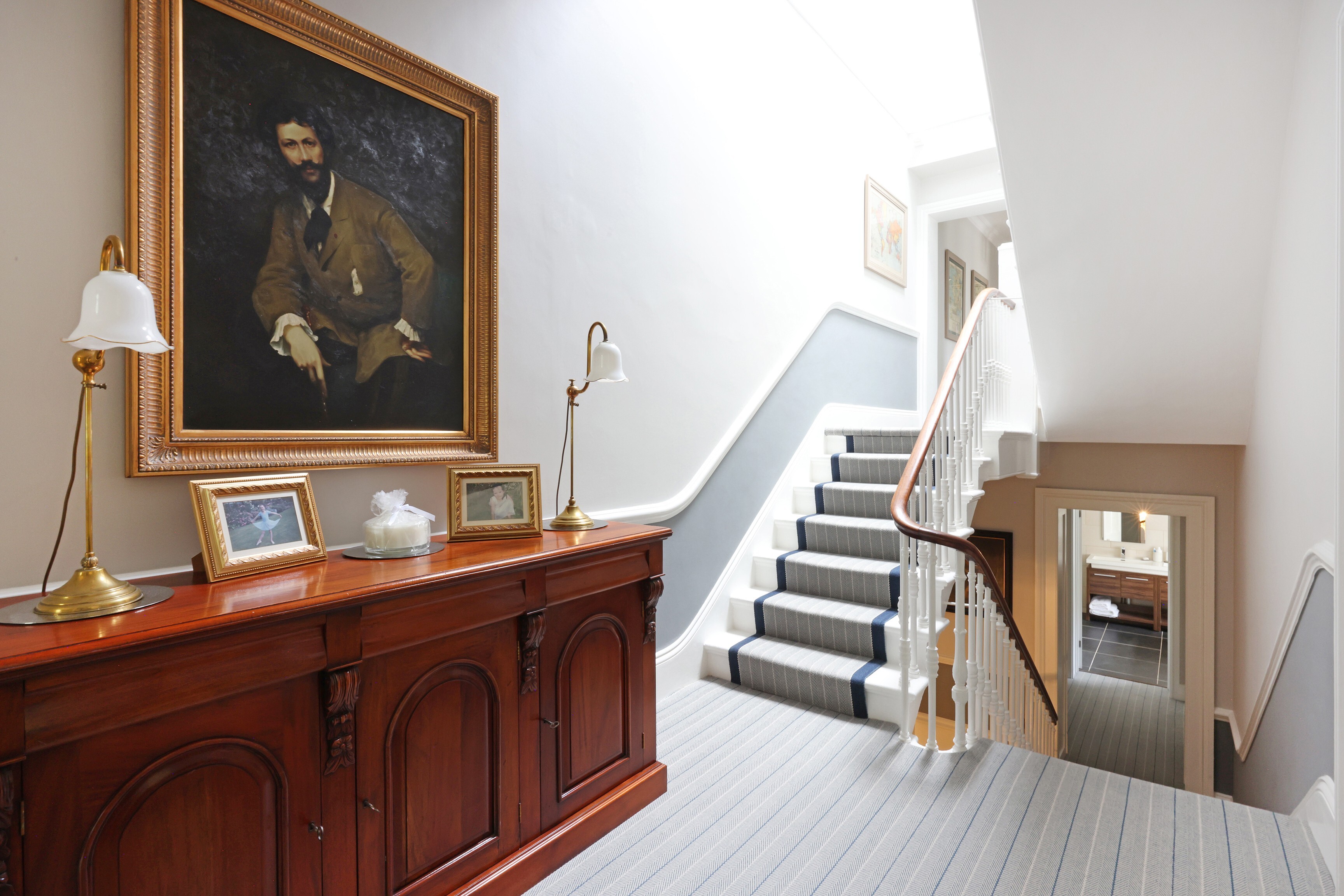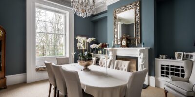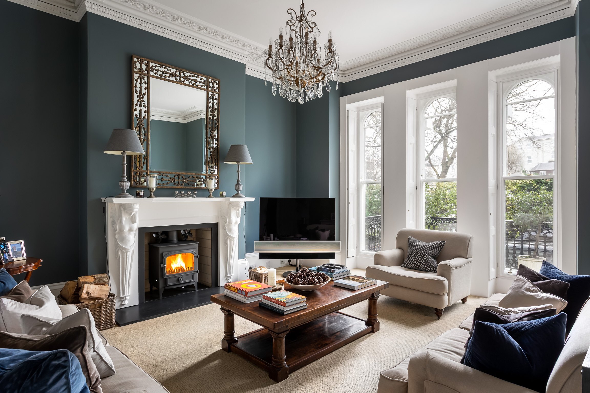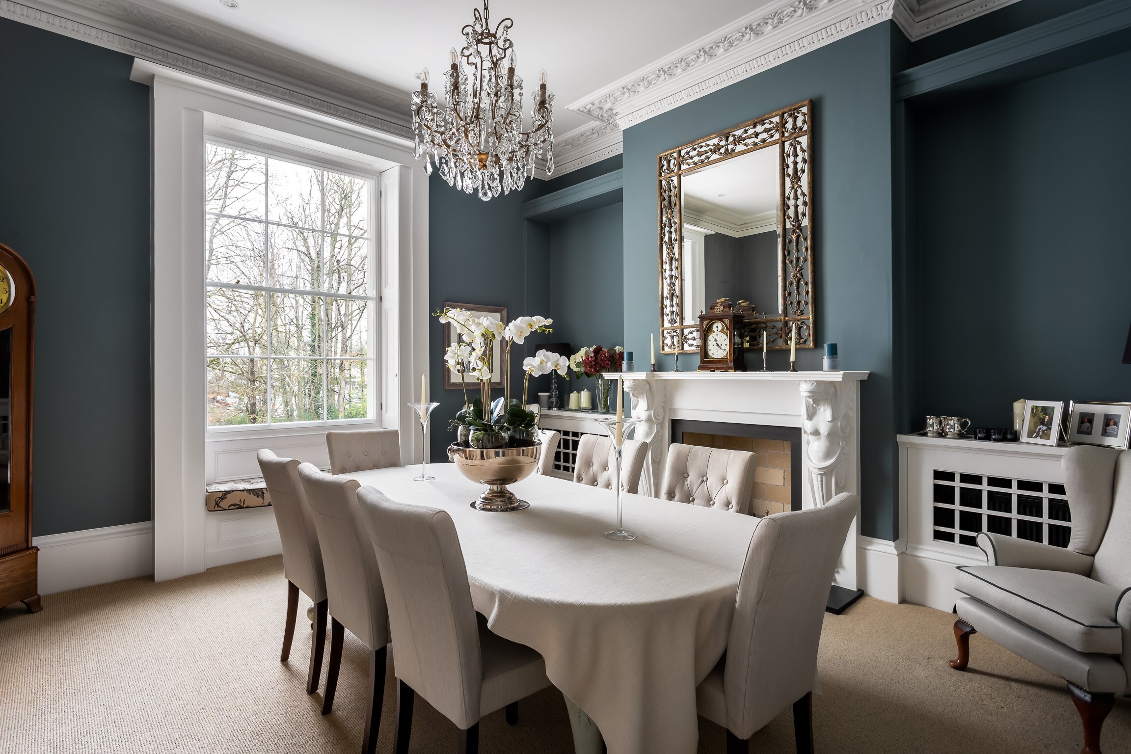 A breathtaking reception hallway, anchored by an elegant cantilevered staircase, creates an immediate sense of arrival and leads to the principal reception rooms. The living room is a wonderfully light and refined space, showcasing soaring ceilings, exquisite cornicing, a handsome period fireplace with log-burning stove, and tall sash windows that bathe the room in natural light. Double doors open seamlessly into the dining room, an equally elegant setting featuring a second period fireplace and tranquil views across the garden.