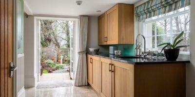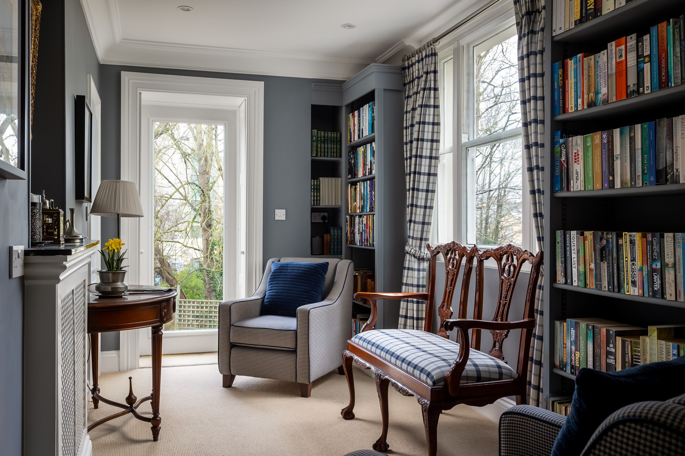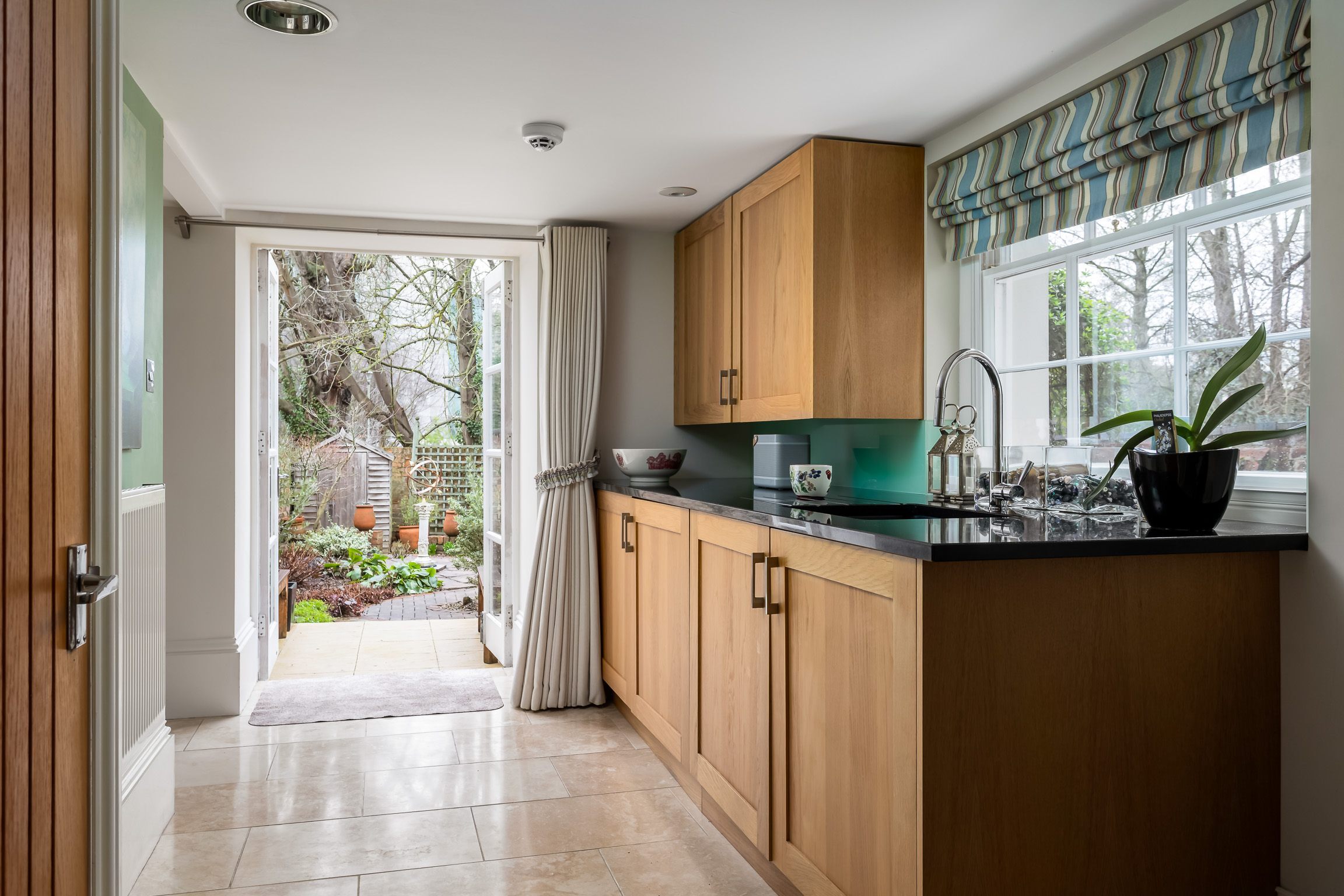 To the rear of the hall lies a beautiful library, offering a peaceful retreat, with steps descending to the lower ground floor which comprises a utility room, cloakroom, and extensive storage. French doors open directly onto the garden, enhancing the home’s effortless indoor-outdoor flow. On this floor, the bespoke kitchen/breakfast room has been thoughtfully designed with generous worktop and storage space and high-quality integrated appliances, combining style with practicality for both everyday living and entertaining.