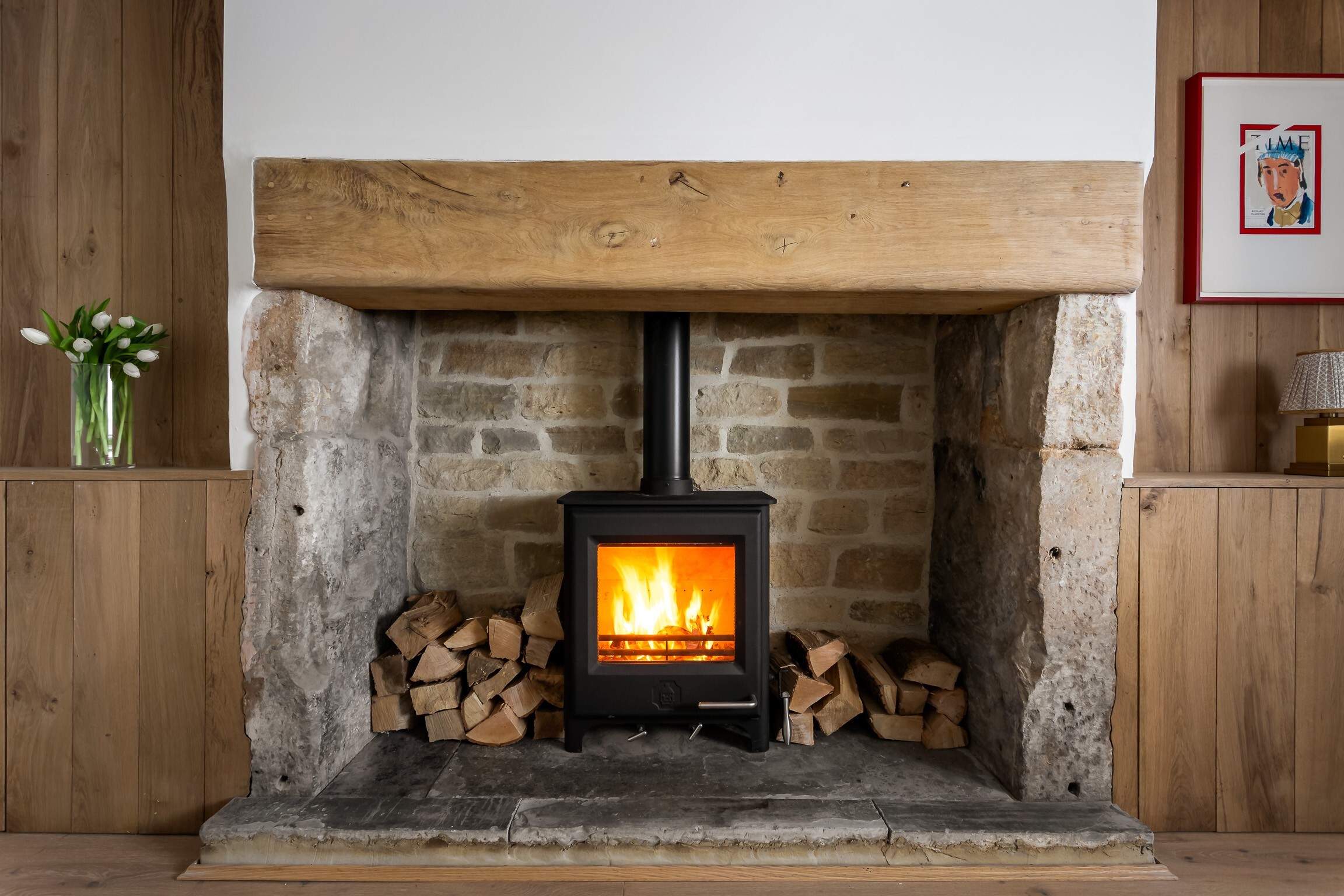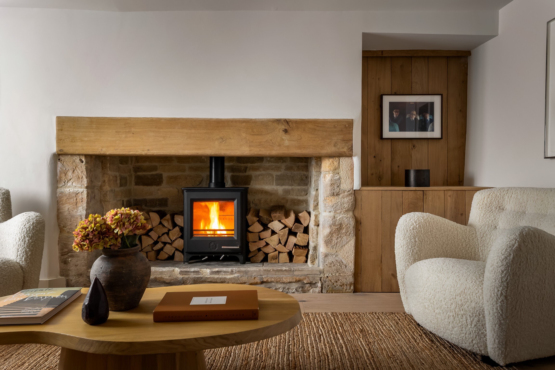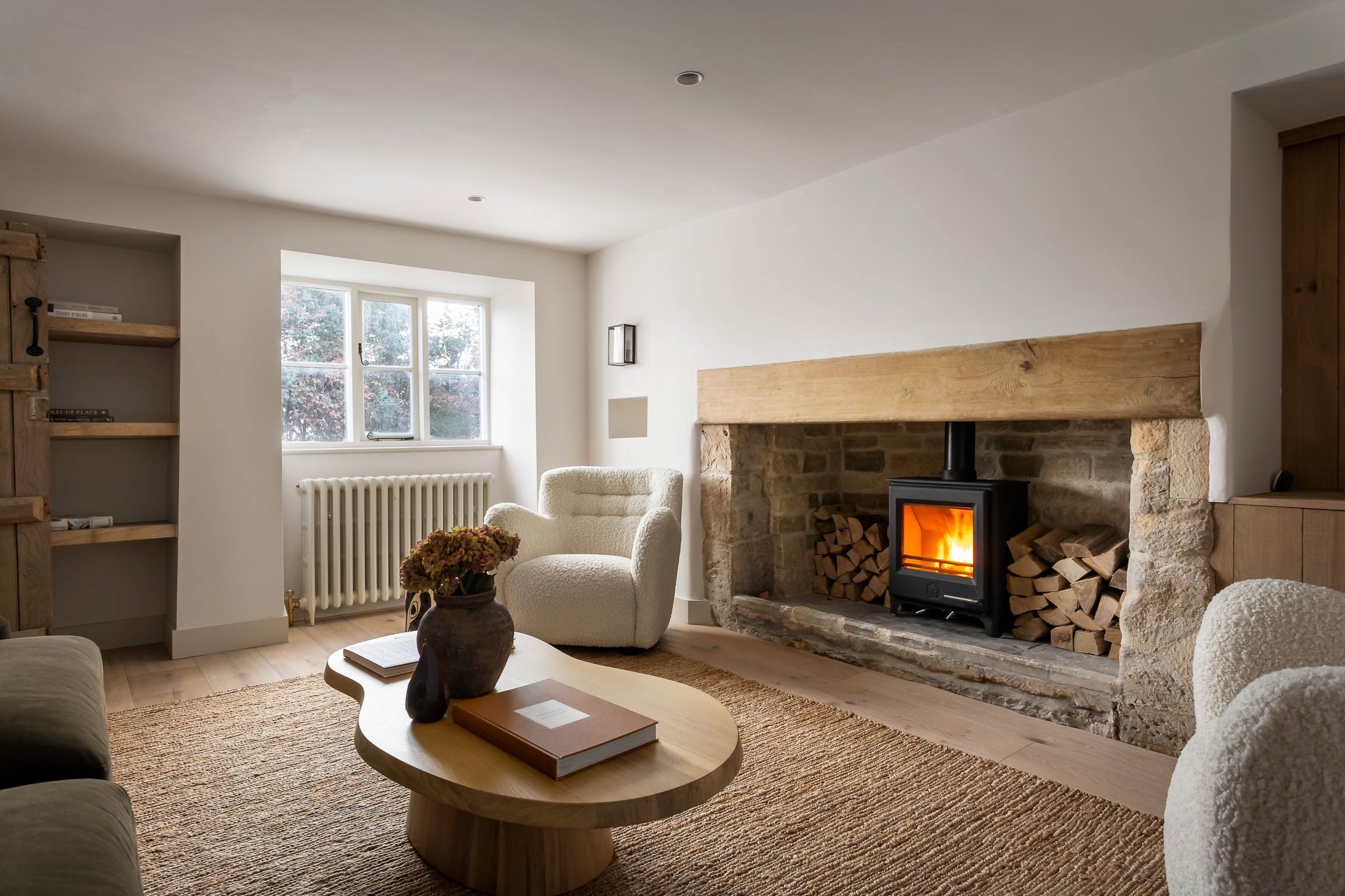 The living room, with its inglenook fireplace and wood burner, is bright and inviting, enjoying views over the village lane — the perfect place to settle in with a good book after a countryside walk. Next door, the sitting room offers a peaceful retreat, equally cosy and welcoming, ideal for relaxed evenings or a favourite film by the fire.