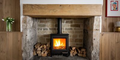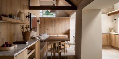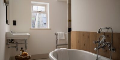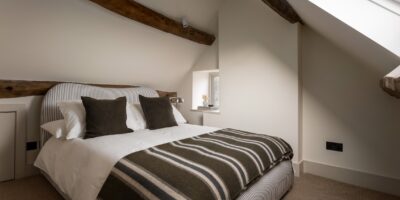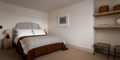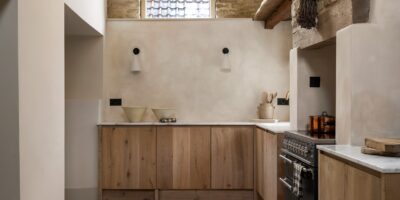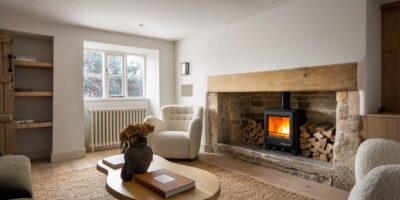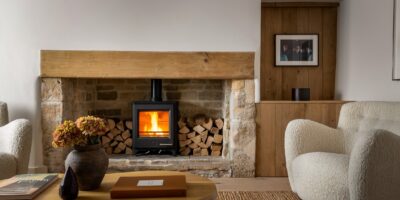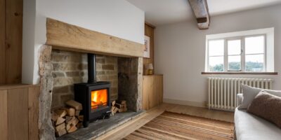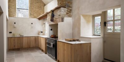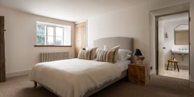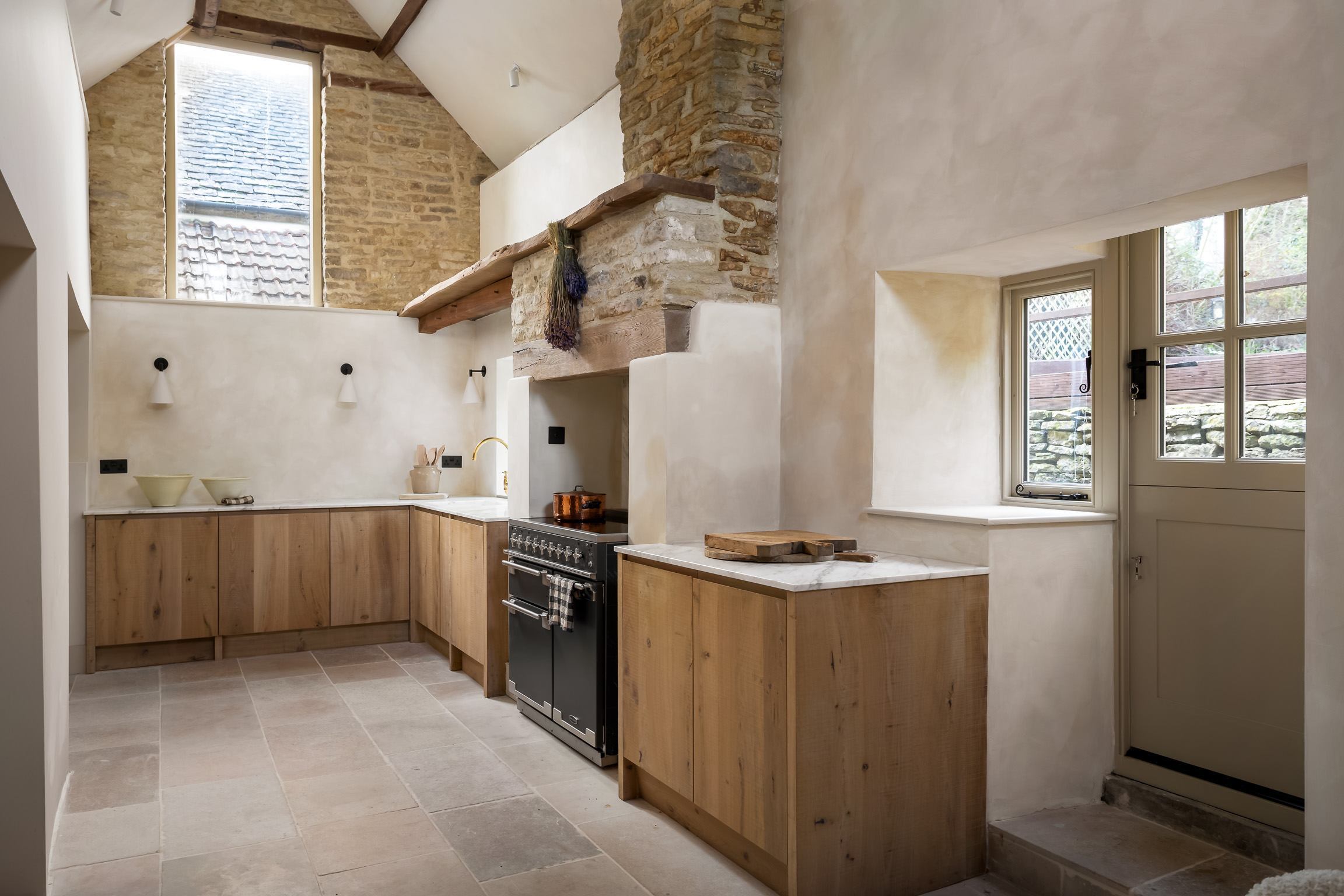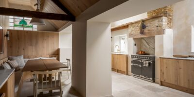At the centre of daily life is the kitchen/dining room, a space made for lingering breakfasts, long lunches and relaxed evenings with friends. The Rangemaster sits proudly at the heart of the room, filling the space with gentle warmth on cooler days, while limestone floors, oak panelling and exposed stone add to the cosy country feel. With plenty of natural light and a stable door opening straight onto the garden, it’s a room that naturally draws everyone together.