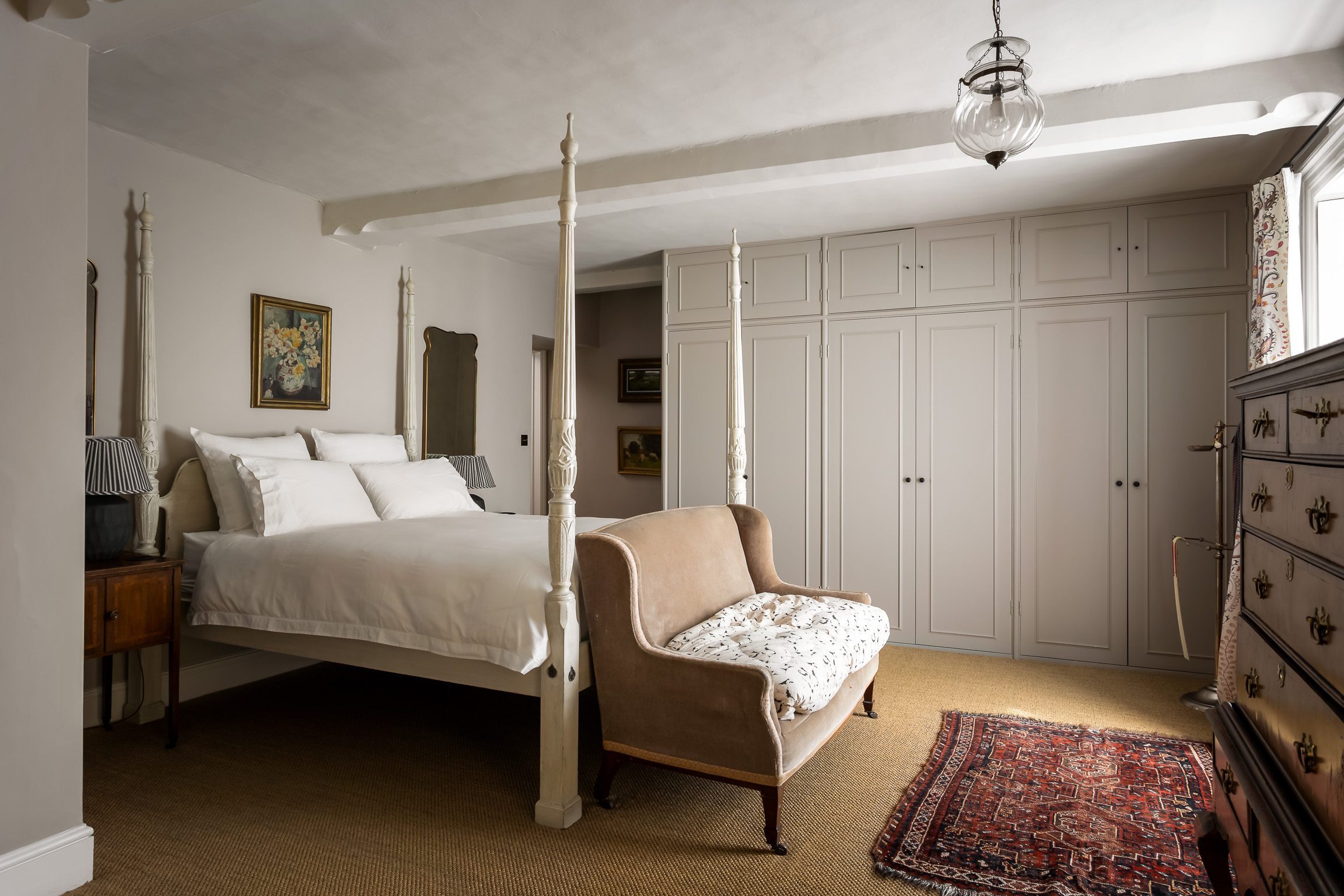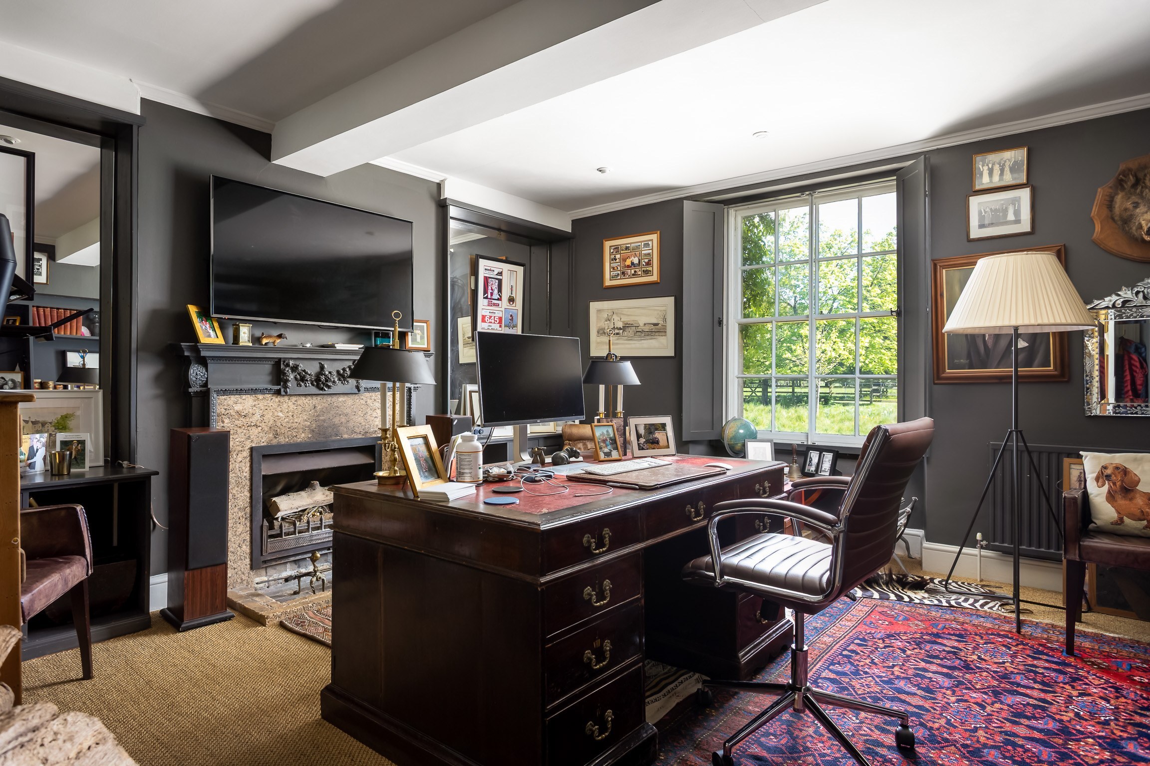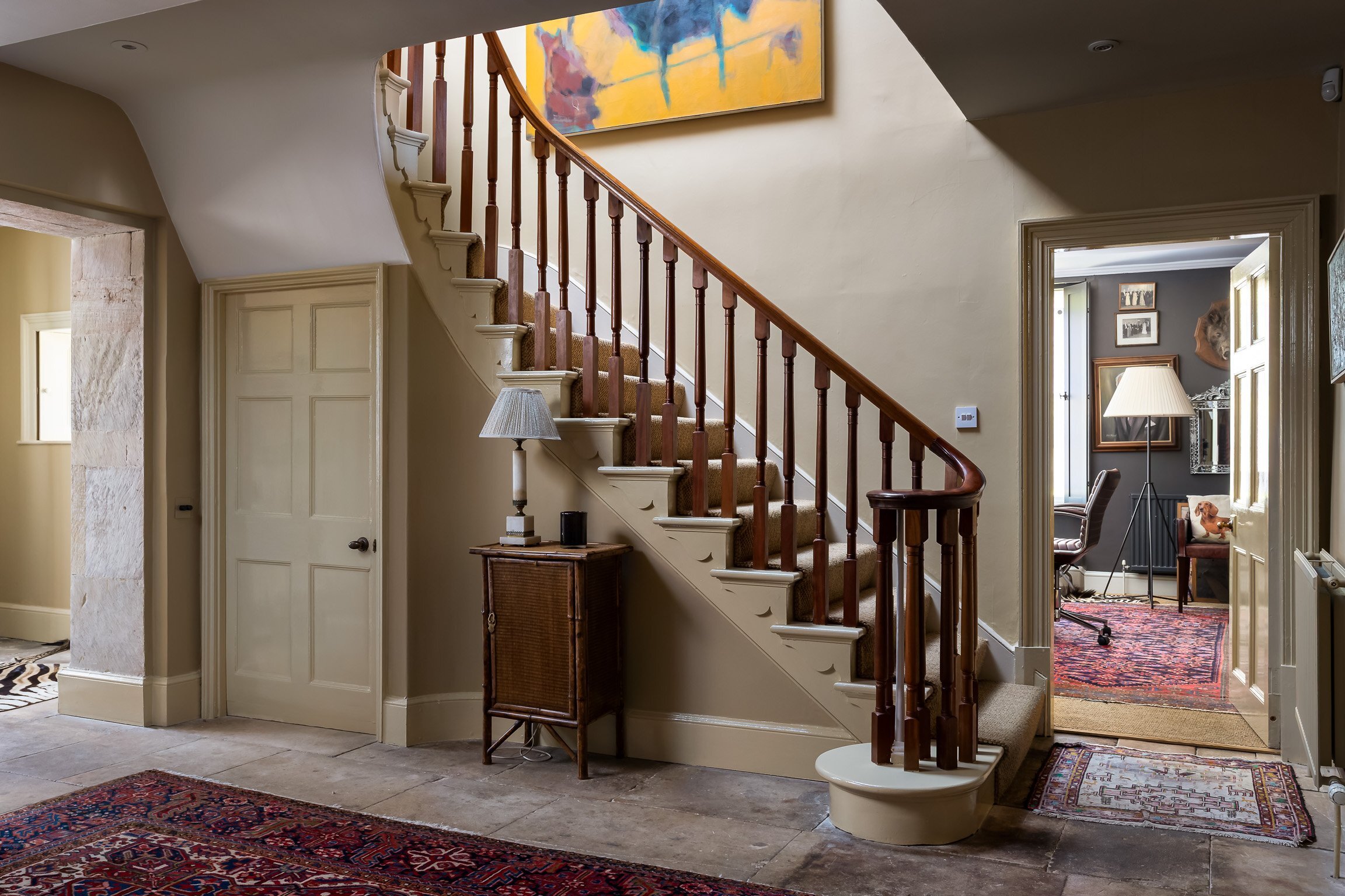 The ground floor is arranged around a central reception hall, where original flagstone floors and a wood-burning stove set an immediately inviting tone. A series of well-proportioned reception rooms – drawing room, dining room, sitting room and study – offer real flexibility for both everyday family life and more formal occasions. Natural light runs generously through the principal rooms, most of which enjoy a south-facing aspect, giving the house a bright and uplifting quality throughout the day.