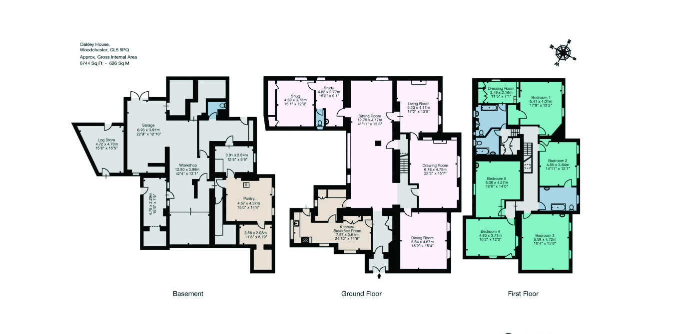 The first floor comprises the principal bedroom suite with dressing room and en suite bathroom. There are four further bedrooms and two bathrooms, offering ample space for family and guests.